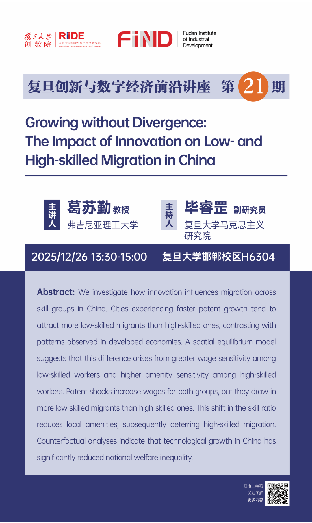 2025年12月26日下午,复旦创新与数字经济前沿讲座第21期在复旦第六教学楼304教室召开,美国弗吉尼亚理工大学经济学教授葛苏勤老师应邀分享其与合作者的研究“Growing Without Divergence: The Impact of Innovation on Low- and High-skilled Migration in China”。讲座由复旦大学马克思主义研究院毕睿罡老师主持,吸引了众多教师与学生的积极参与。讲座开篇,葛老师指出,许多发展中国家在经济增长的过程中,往往伴随着区域间分化的加剧,...
