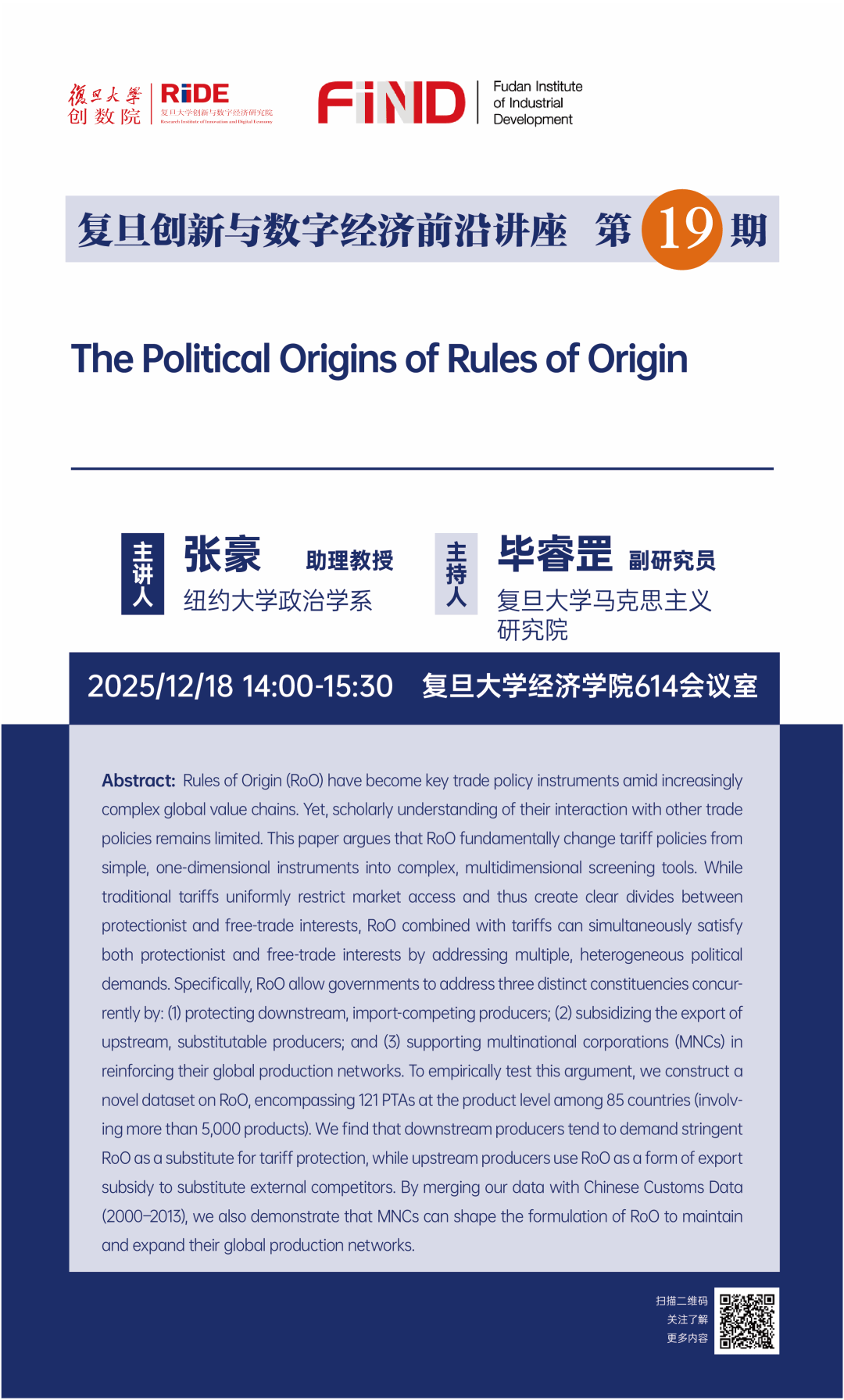 2025年12月18日下午,复旦创新与数字经济前沿讲座第19期在复旦大学顺利召开。纽约大学政治学系张豪助理教授应邀分享其与合作者的最新研究“The Political Origins of Rules of Origin”。讲座由复旦大学马克思主义研究院毕睿罡老师主持,吸引了众多师生的积极参与,张老师同各位与会者就原产地规则的政治起源展开了深入探讨。在讲座开篇,张老师首先立足于全球价值链日益复杂的宏观背景,指出了原产地规则(Rules of Origin, RoO)作为重要贸易政策工具的崛起。...