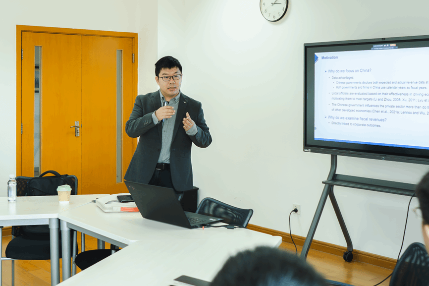 2025年10月27日下午,复旦创新与数字经济前沿讲座第16期在复旦大学经济学院710会议室召开。复旦大学保险应用创新研究院的杨国超教授应邀分享其与合作者的最新研究“The lmpact of Government Target-Based Revenue Manipulation on Firms”。讲座由复旦大学马克思主义研究院毕睿罡老师主持,吸引了众多教师和学生的积极参与,杨老师同各位参与者展开了深入探讨。