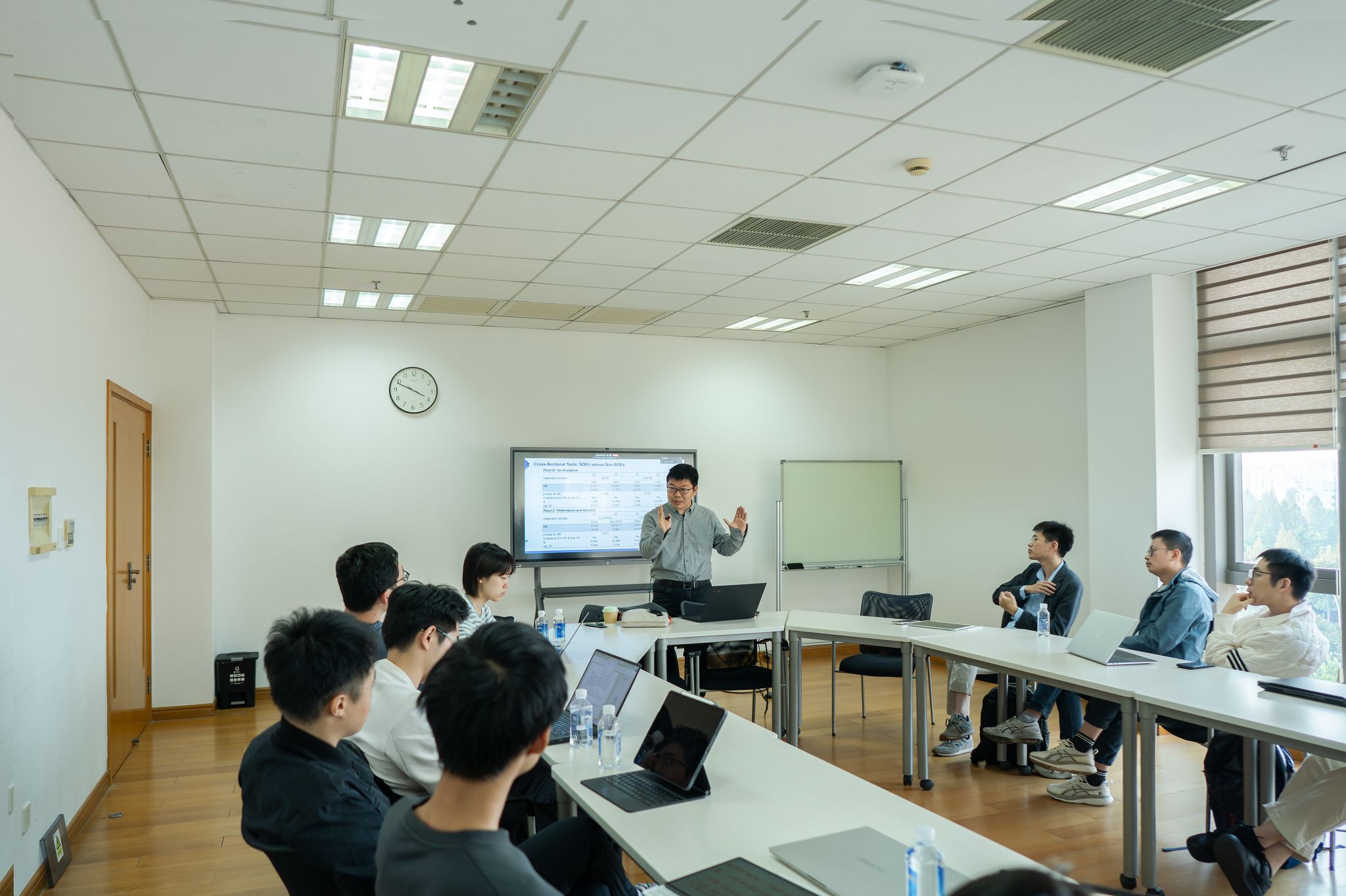 在随后的研讨环节,与会的老师和同学围绕报告内容进行了深入而富有建设性的交流。讨论焦点主要集中在三个方面:首先,大家就中国独特的制度背景探讨了自己的理解,以及现行财政管理体制下经济主体的激励逻辑;其次,对研究中可能存在的内生性问题展开了严谨的学术探讨,并就如何通过更精巧的计量经济学方法识别财政政策与企业行为之间的因果关系提出了多项宝贵建议;最后,讨论还进一步深入到潜在的作用机制。